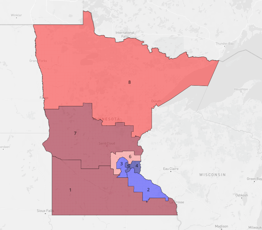 My attempt at a hypothetical Minnesota gerrymander to the level of the previous North Carolina gerrymander (that they are re-gerrymandering because it's not good enough). And yes it is colored by 2024 margins.