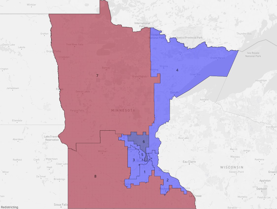 And fwiw, a rough example of a fair MN map by measure of proportionality, efficiency of partisan votes and partisan bias in a hypothetical 50/50 race. Yeah, it does skew a bit R still, but I chose to keep more communities of interest intact. Walz lost this 6 by ~4 and Harris