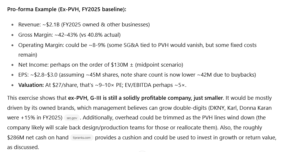 $GIII is crazy cheap. If you completely strip out TH/CK business, its PE is still around 10 with net cash of $286 million. You pay $850 million for Karl Lagerfeld (grew 30% in NA last quarter), DKNY, Donna Karan, Vilebrequin, G.H. Bass (yeah, loafers and boat shoes) and Sonia