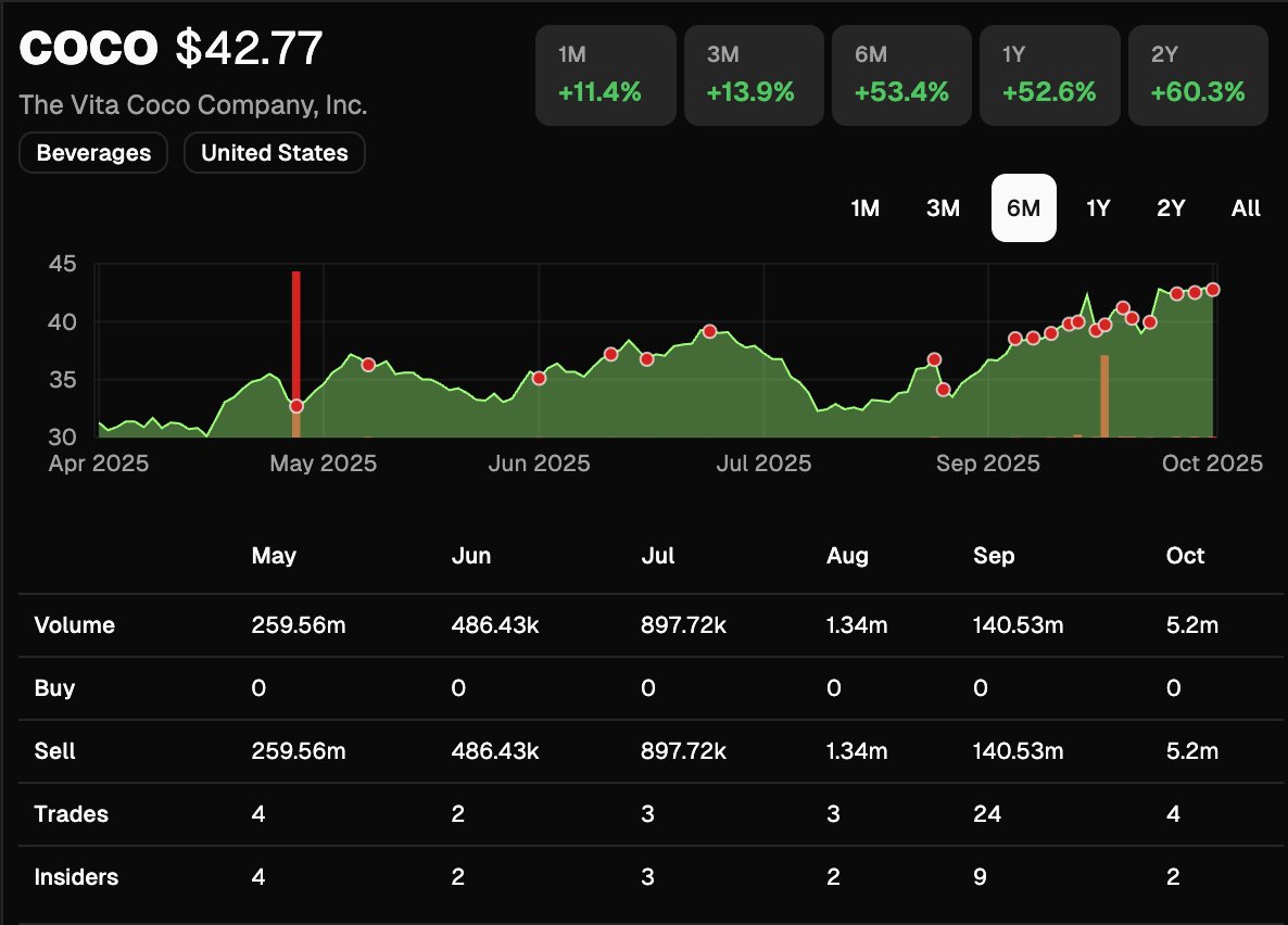Insider selling at Vita Coco (COCO) has been ramping up over the last month. Now 9 different insiders making 30 sales for over $145M in sales since September. Stock is up 50% in the last year while earnings estimates remain basically flat