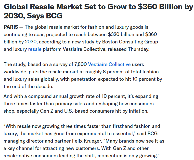 Biggest headwind for luxury is resale. That’s why I’m skeptical of $KER’s strategy of betting on resale-native Gen Z. Currently, 80% of transactions are in leather goods, apparel & footwear but watches and jewelry are growing fast $WOSG $UHRN $CFR. Stocks to watch: $REAL $TDUP
