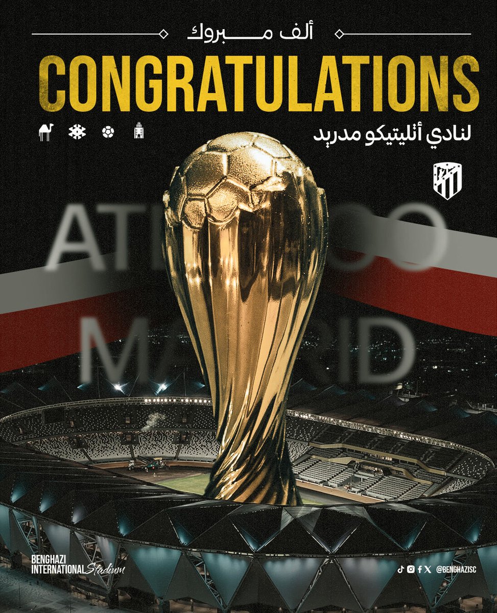 أتلتيكو مدريد يعتلي منصة المجد 🔴🔵 وكأس الإعمار يلمع تحت سماء بنغازي المضيئة بالألعاب النارية ☄️ لحظة جمالية خالدة… جمعت سحر الكرة العالمية بروح ليبيا الجديدة 🇱🇾 #كأس_الإعمار #FDRL_Cup