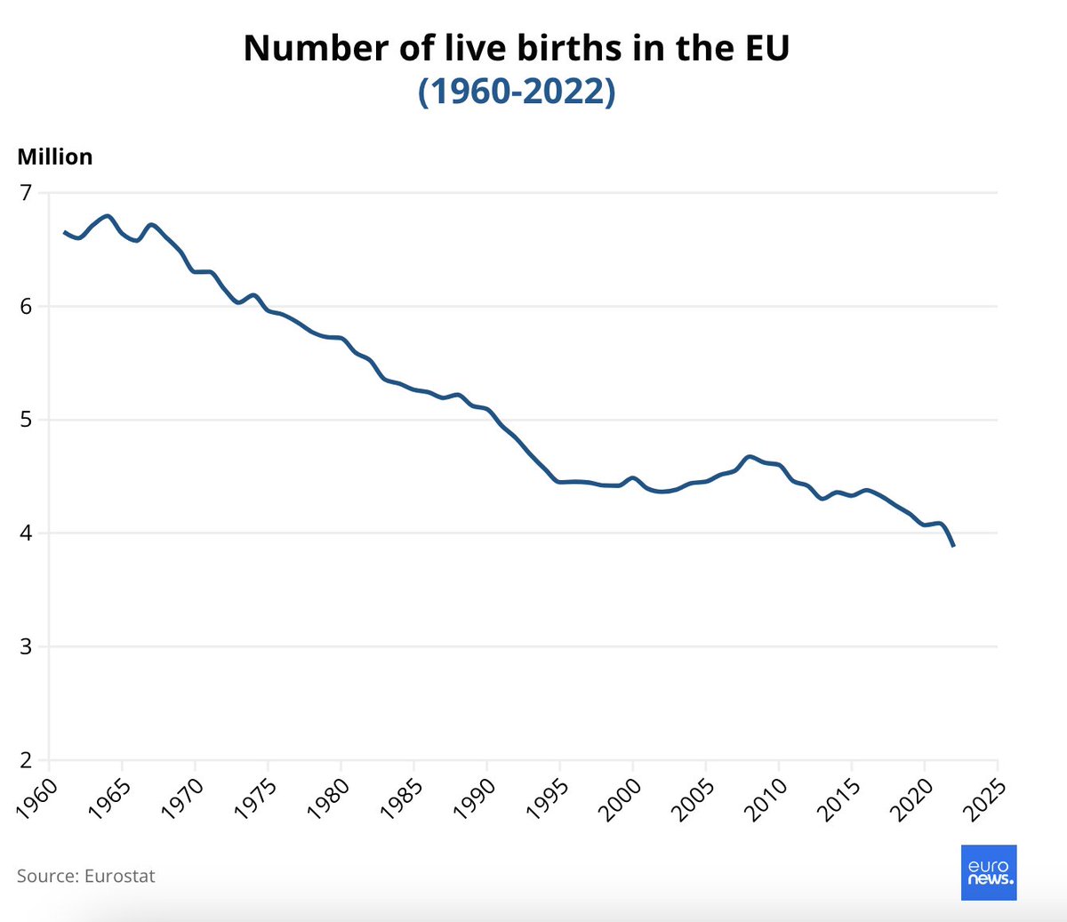 🇪🇺 EU FACES FERTILITY CRISIS: BIRTHS HIT RECORD LOW For the first time since 1960, the EU’s live births dropped below 4 million, with just 3.88 million babies born in 2022. The EU’s average fertility rate is now 1.46, well below the global average of 2.27. Malta (1.08), Spain