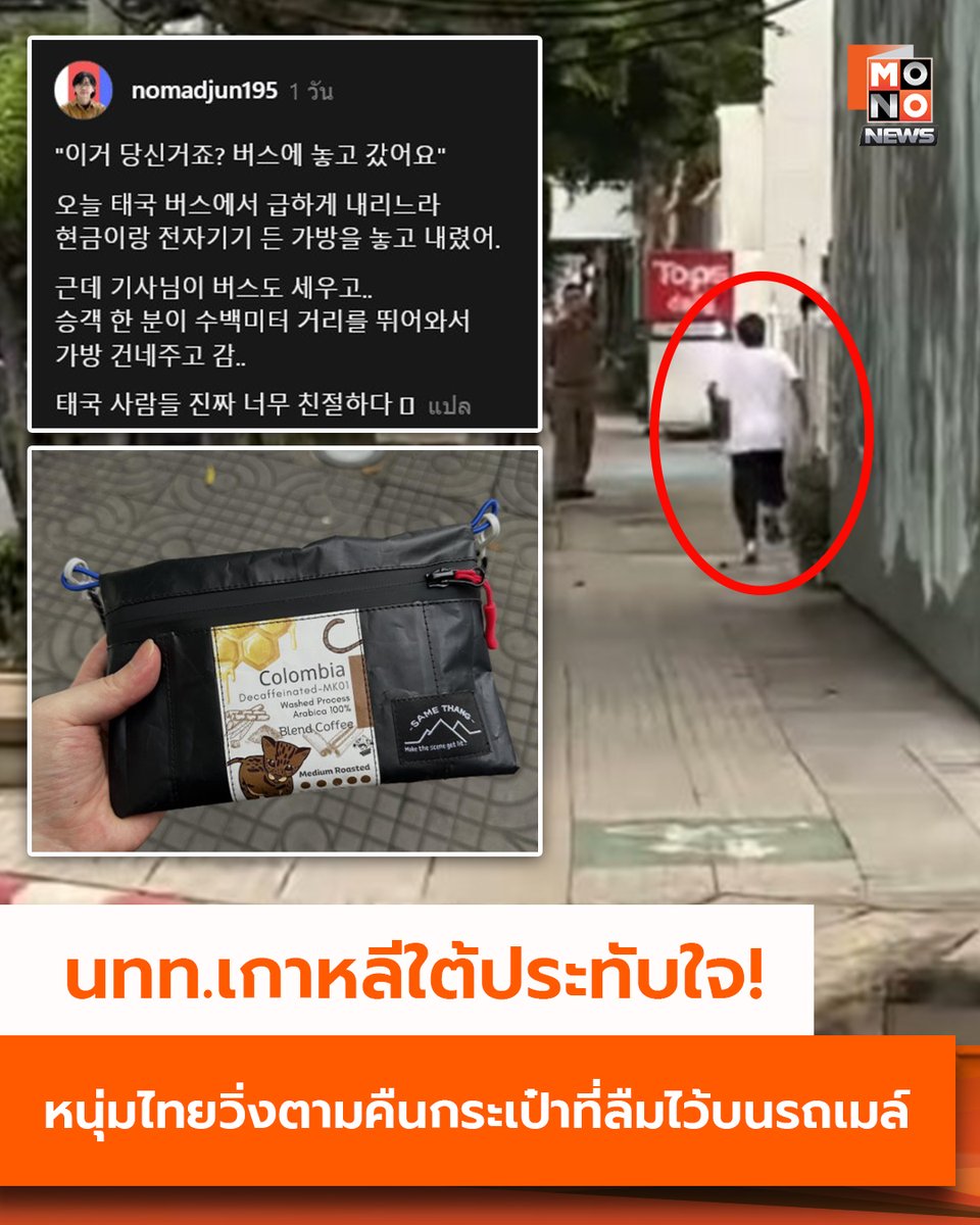 "คนไทยมีน้ำใจมาก" นทท.เกาหลีใต้ชื่นชม พลเมืองดีชาวไทยวิ่งตามส่งคืนกระเป๋าที่ลืมไว้บนรถเมล์ เรื่องราวสุดประทับใจเกิดขึ้นกับนักท่องเที่ยวชาวเกาหลีใต้รายหนึ่ง โดยเมื่อวันที่ 13 ตุลาคม 2568 นักท่องเที่ยวรายนี้ได้โพสต์เล่าประสบการณ์ผ่านโซเชียลมีเดียว่า