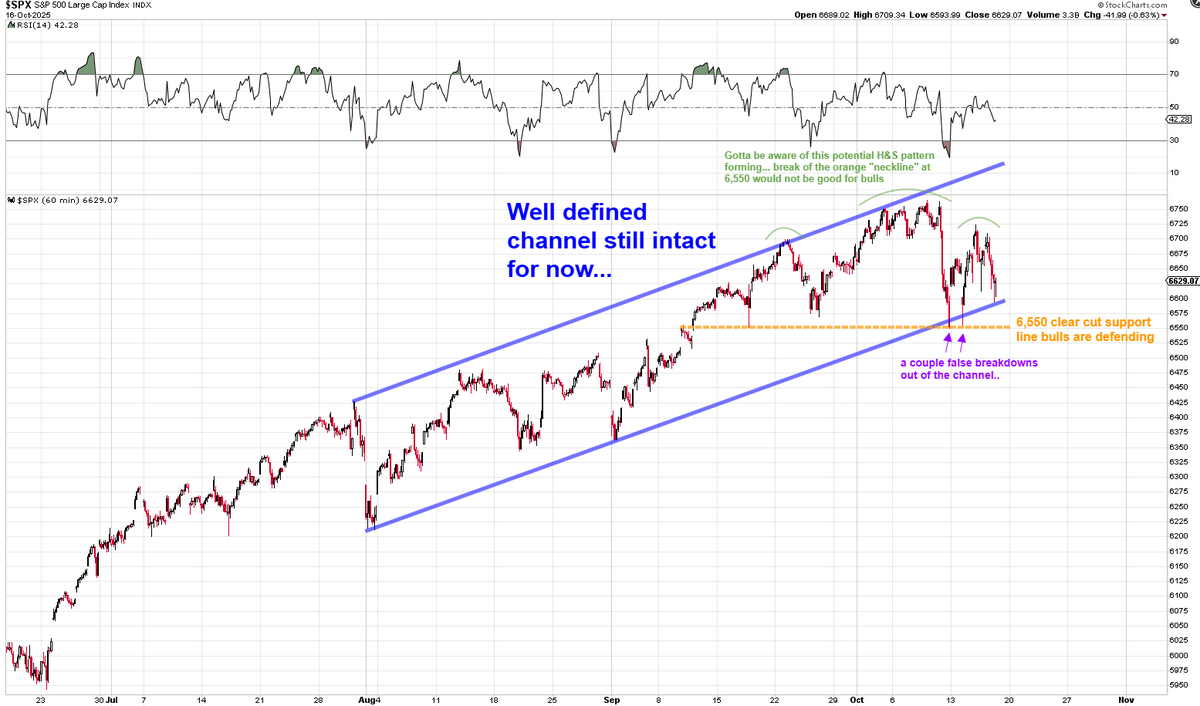 $SPX Hourly Chart Update: Very well defined channel resistance and support lines in blue. Very well defined support level at 6,550 in orange. Very notable potential head and shoulders pattern in green. Big test tomorrow for bulls to stay within the channel or at least hold