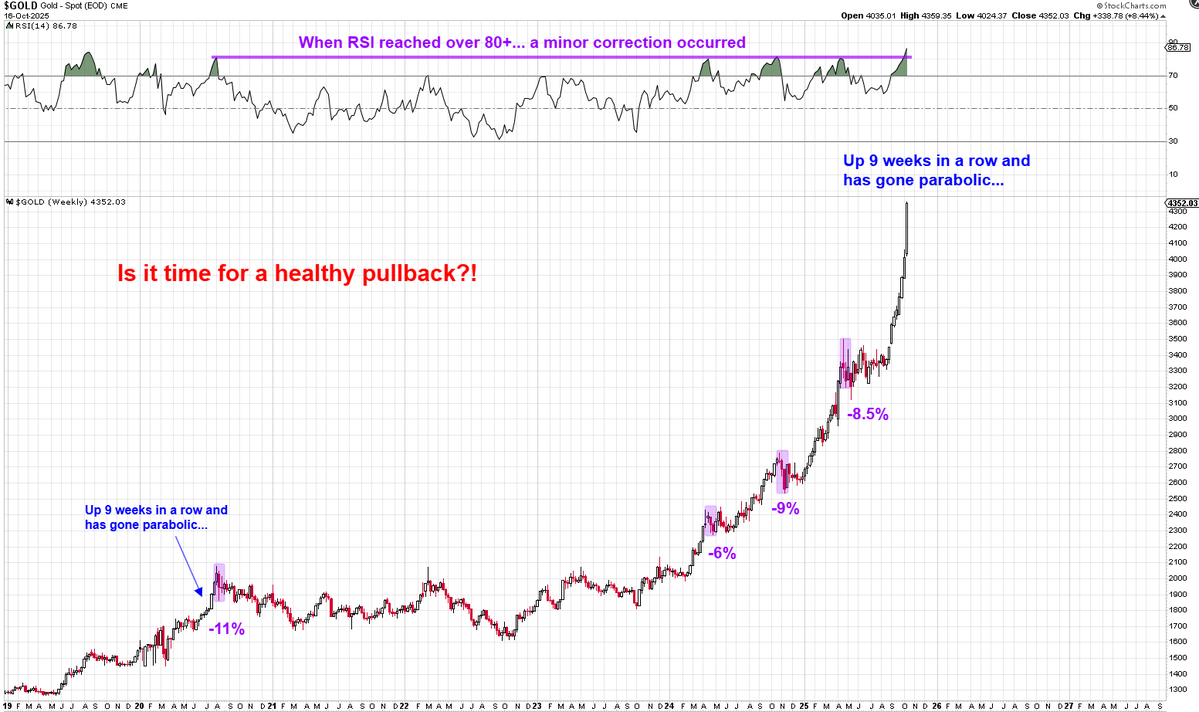 $GOLD is tied for the longest weekly winning streak since 2010. It is now up 9 weeks in a row. The last time it did something like this was back in 2020. The 10th week, it dropped 11%. Also, look at the last 4 times RSI's hit over 80 and how it performed the following week(s).