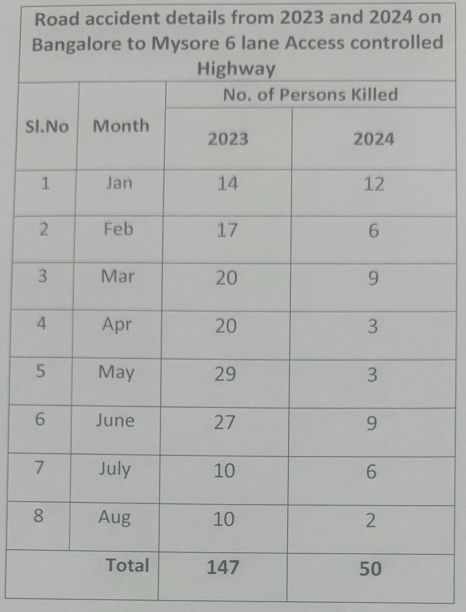Deaths due to road accidents on Bengaluru- Mysore Highway down to 2 in August 24 Saving 97 precious lives is worth increasing the travel time by 15 minutes “Rash and distracted driving still remains the single most aggravating factor causing road accidents on this Highway too”