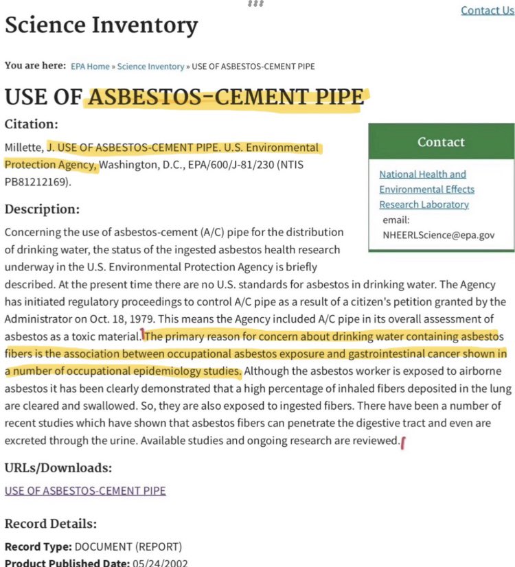 @EACCanada See ⬇️ an example of a product, which is used my millions, which contains a carcinogen, which no one seems to know about - asbestos cement water pipes. @sqirlgirly @2021boilingfrog @PreventCancerNw @CWWACEPU @JoshRCrabb #ACpipes