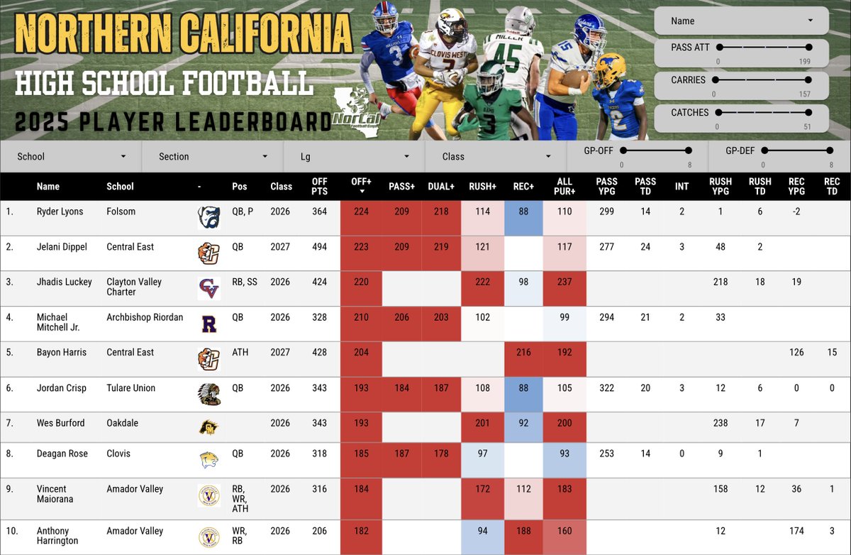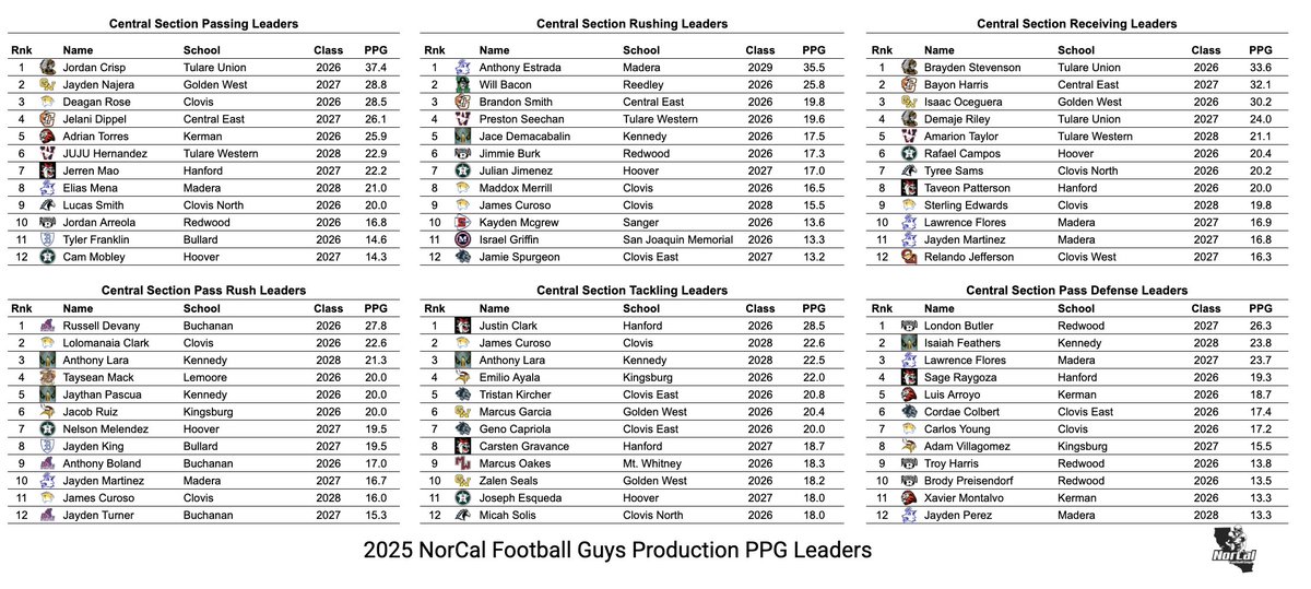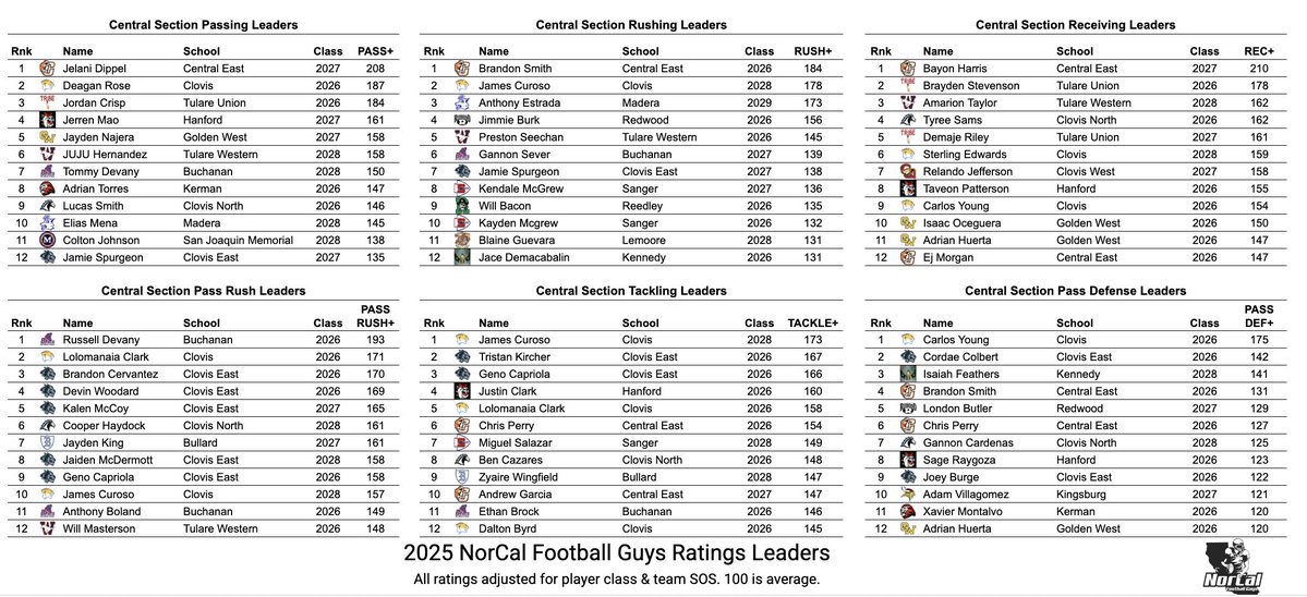 @Zionjs24 @Luke_Lucatello @Sam_Whelan12 @CahoonChase @TalisPayne @JaxxonTweedt @ColeDawes2027 @Matteo_lortie18 @Isaiahene5 @devin_ras18 Central Section (Fresno portion) 🏈 Ratings Leaders