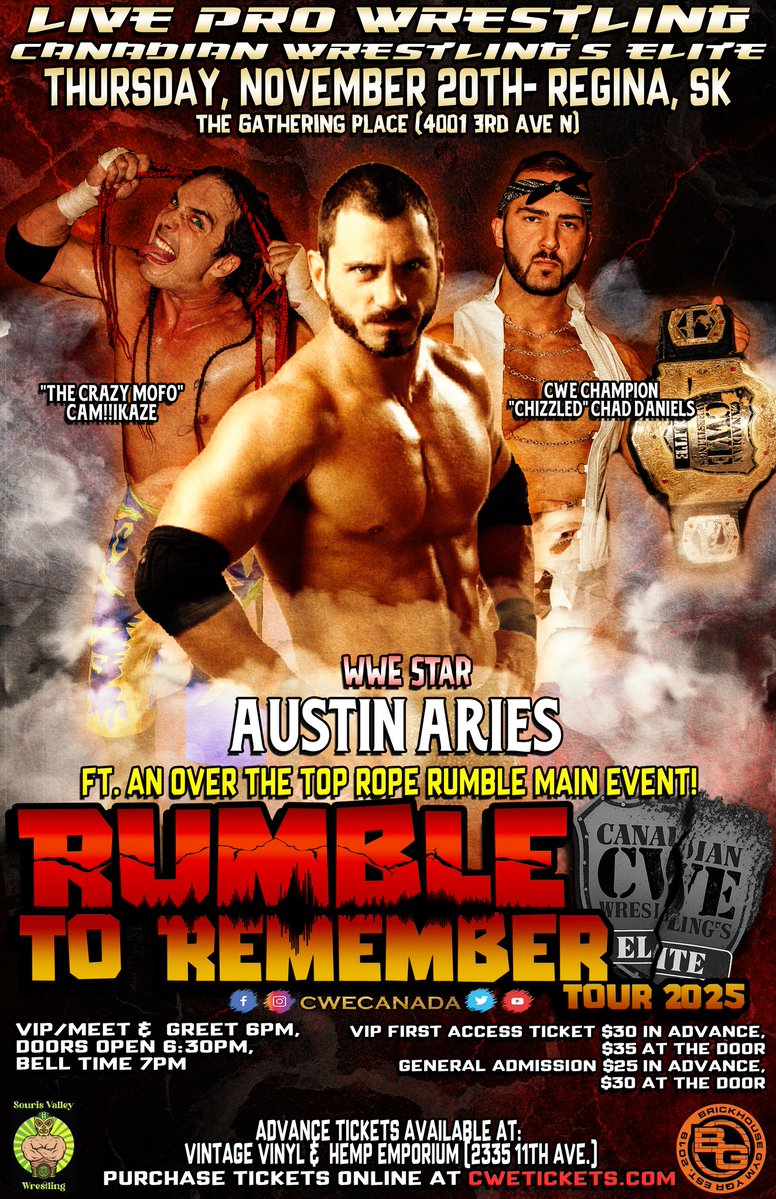 Canadian Wrestling's Elite Returns To The Queen City with a stop on The Rumble To Remember Tour in Regina, Saskatchewan on Thursday, November 20th Featuring WWE Alumni & Former TNA & ROH World Champion @AustinAries & An Over The Top Rope Rumble Main Event!