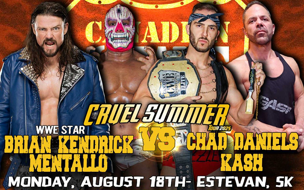 CWE mega powers, the Chizzled Champion and the Canadian Rottweiler, team up to take on "Zombie Killer" Mentallo and WWE alumni, Brian Kendrick in Estevan, SK this August!