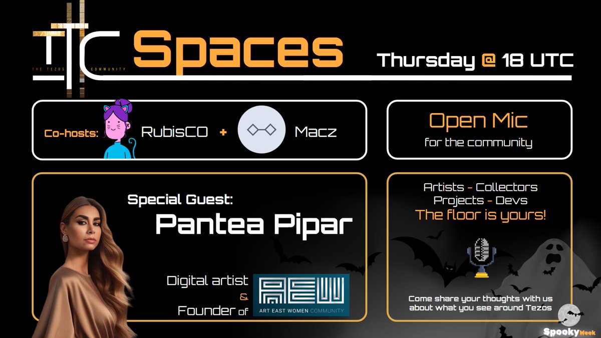 It's today! Space time! 🔔 https://t.co/OK4AM37l6o 📅 Oct 16 | 18:00 UTC Join our hosts @AuRo404 & @proto_designer for a talk with the lovely @pantea_pipar to learn more about her journey, her art, and her community-driven initiatives, like #AEW, the Art East Women Community