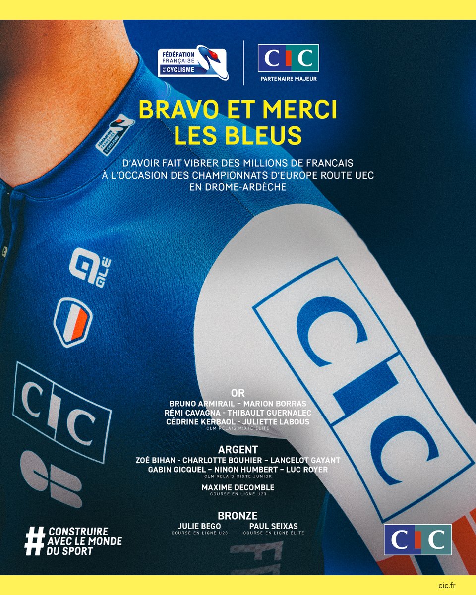 🇫🇷 5 médailles européennes dont 1 titre pour l’Equipe de France aux Championnats d’Europe Route en Drôme-Ardèche ! 🚵 ✨ Le CIC, partenaire majeur de la @FFCyclisme, félicite les Bleus pour leurs belles performances individuelles et collectives. #ConstruireAvecLeMondeDuSport