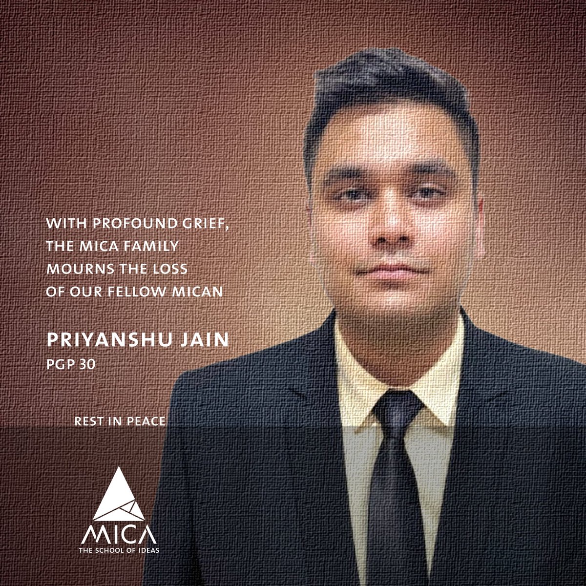MICA mourns the loss of Priyanshu Jain, a 2nd year student and a valued member of the MICA family. During these difficult times, we stand together as a community and extend our unwavering support to his family. His untimely departure leaves a profound void among all of us. RIP.