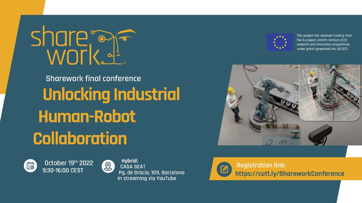 #Sharework celebrates in Barcelona its Final Conference Reserve your seat for free to hear from 4 companies that have implemented #CollaborativeRobotics technologies in their shopfloors for the assembly and disassembly of industrial components 🗓️19/10 https://t.co/b9Aona7LAJ