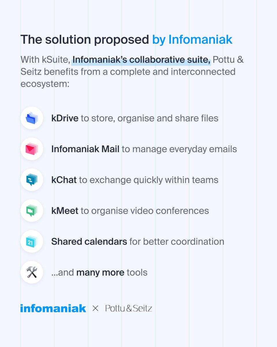 Comment une entreprise de 80 collaborateurs a-t-elle réussi à simplifier son organisation et fluidifier ses échanges au quotidien grâce à kSuite ? Retour sur l’expérience de Pottu & Seitz avec la suite collaborative d’Infomaniak 👉 une solution simple, efficace et durable, qui