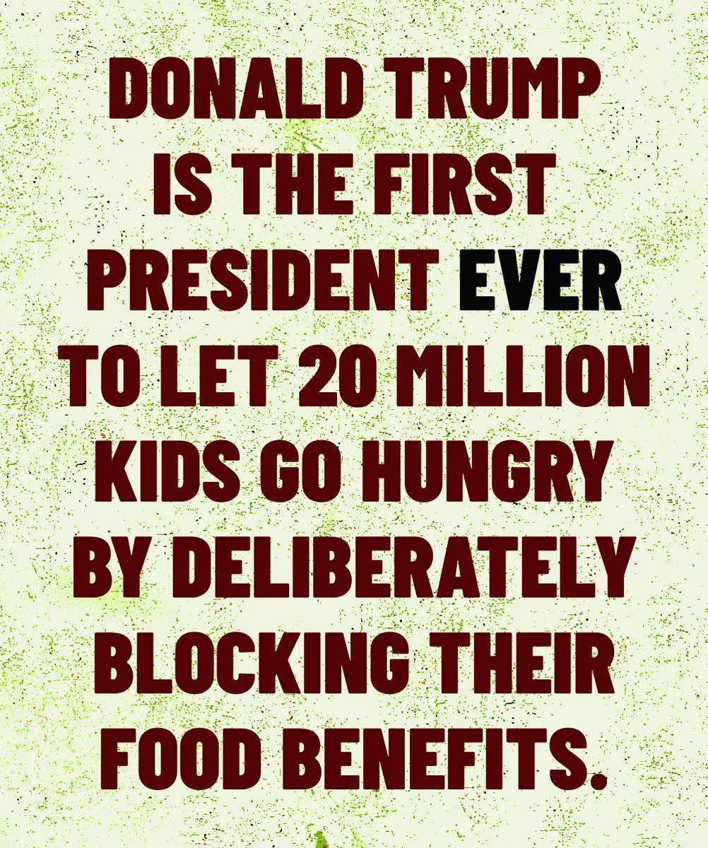 I want you to rewatch and reread this 18 times. Donald Trump is the first president in US history to deny food to citizens. Us.
