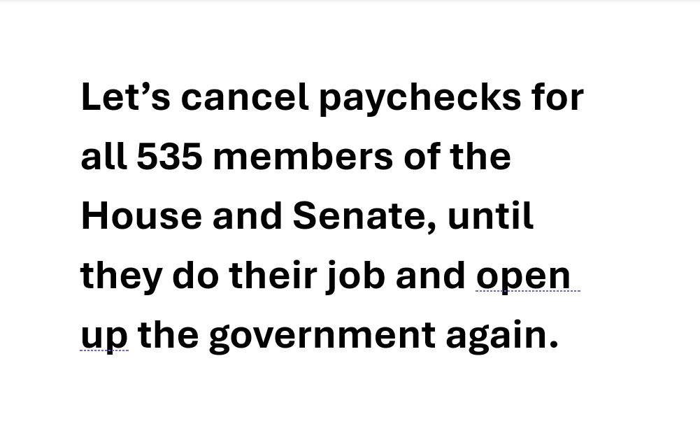 If Congress would stop getting paid during a shutdown, then there would never be another government shut down again.
