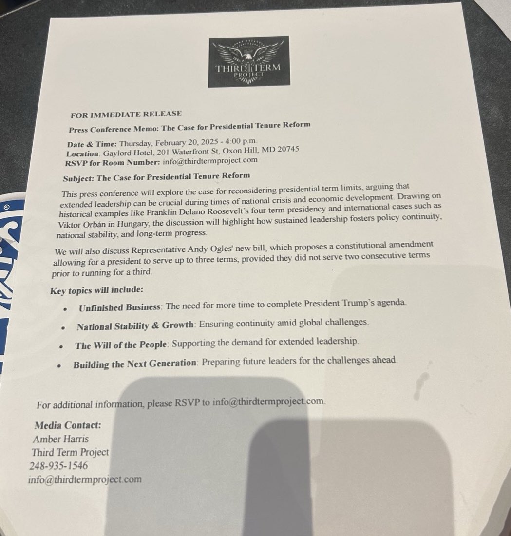 🚨 EXCLUSIVE: A leaked CPAC press memo shows the “Third Term Project” hosting a Feb. 20 event titled “The Case for Presidential Tenure Reform.” They’re openly arguing for a constitutional amendment to let Trump serve up to three terms; citing “unfinished business” and