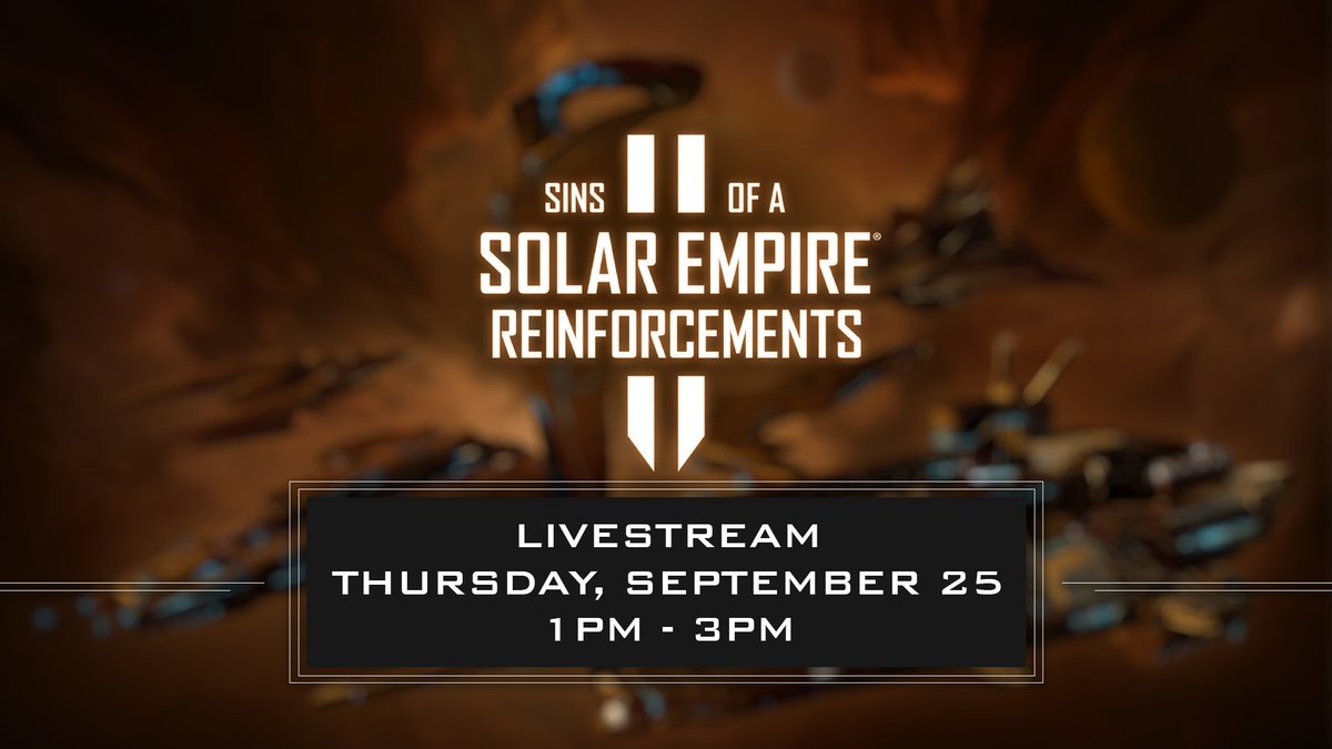 Join us on Sep 25 at 1:00pm as we dig deep into the new ships and victory conditions in the newest DLC for Sins of a Solar Empire II, Reinforcements! π§‘ Set Reminder: https://t.co/XeANJqfgnH
