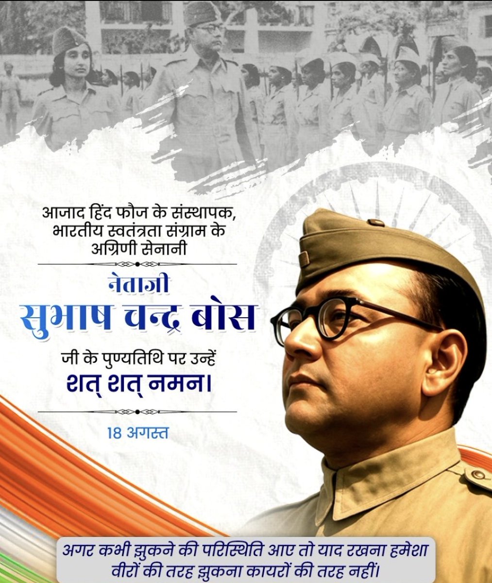 “अगर कभी झुकने की परिस्थिति आए तो याद रखना हमेशा वीरों की तरह झुकना कायरों की तरह नहीं।” आजाद हिंद फौज के संस्थापक, भारतीय स्वतंत्रता संग्राम के अग्रिणी सेनानी नेताजी सुभाष चन्द्र बोस जी के पुण्यतिथि पर उन्हें शत् शत् नमन।